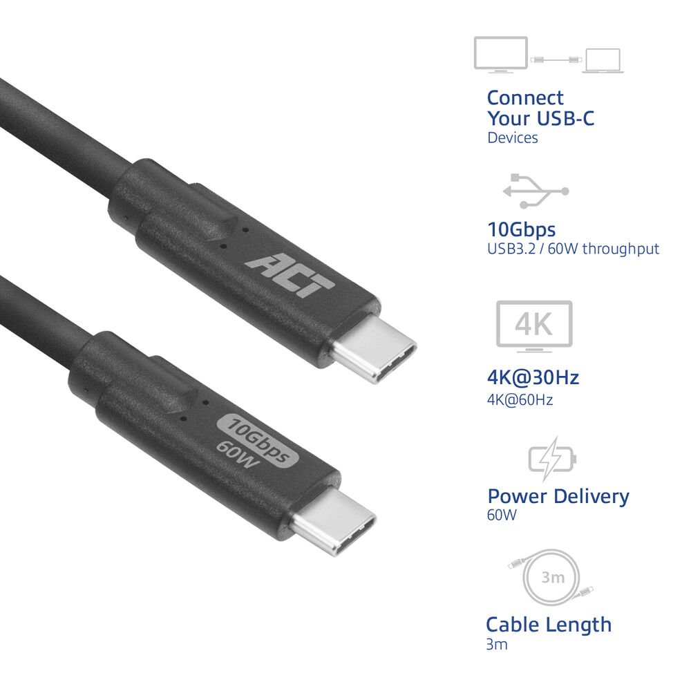 ACT AC7443 | USB 3.2-Kabel | 10 Gbit/s | 60 W | USB-C auf USB-C | 3 m | Schwarz