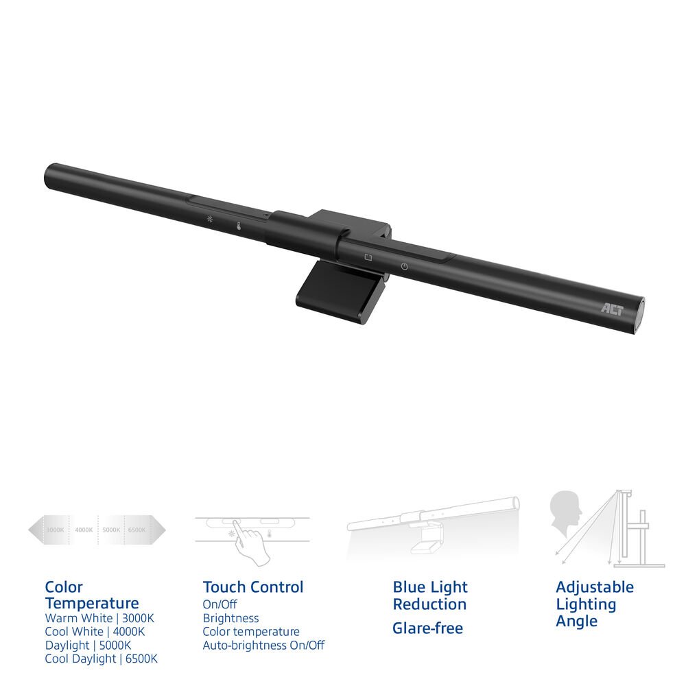 Die dimmbare LED-Lichtleiste ACT AC8055 für Monitore wurde entwickelt, um eine optimale Ausleuchtung Ihres Monitors und Ihres Arbeitsbereichs zu gewährleisten und so Ihre Produktivität und Ihren Komfort zu verbessern. Perfekt für Arbeiten in Umgebungen mit wenig Licht. Diese kompakte, USB-betriebene Lichtleiste bietet vier Farbtemperatureinstellungen: Warmweiß (3000 K), Kaltweiß (4000 K), Tageslicht (5000 K) und Kaltes Tageslicht (6500 K). Zusammen mit der anpassbaren Helligkeit können Sie Ihr Beleuchtungserlebnis individuell gestalten. Die Speicherfunktion speichert Ihre bevorzugten Einstellungen, sodass Sie Ihre letzte Konfiguration ganz einfach wiederherstellen können.