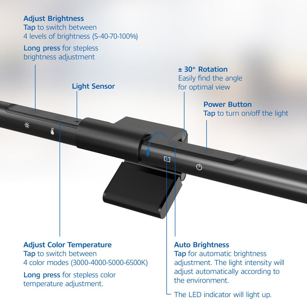 Verbringen Sie lange Stunden vor Ihrem Monitor in einer Umgebung mit wenig Licht? Die LED-Lichtleiste AC8055 ist die perfekte Lösung. Die LED-Lichtleiste für Monitore hat ein stilvolles und kompaktes Design. Das asymmetrische, blendfreie Design verhindert Lichtreflexionen auf Ihrem Bildschirm und sorgt so für ein besseres Seherlebnis.