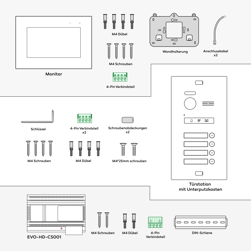 BALTER EVO HD - 2-Draht IP-BUS KIT, Silver Full HD Türstation für 2 Teilnehmer, 175° + HD 7" Monitor, Touchscreen + Hauptstromverteiler