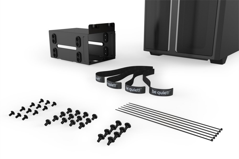 Das PSU-Schild verdeckt die Kabel und die PSU perfekt. Es enthält auch einen doppelten HDD-Käfig mit entkoppelten Halterungen, die Vibrationen reduzieren und das Geräusch minimieren. Der Käfig kann auch verschoben werden, um einen Radiator mit bis zu 360 mm an der Vorderseite zu installieren. Die Stromversorgungseinheit kann einfach von hinten installiert werden, montiert an der mitgelieferten PSU-Halterung.