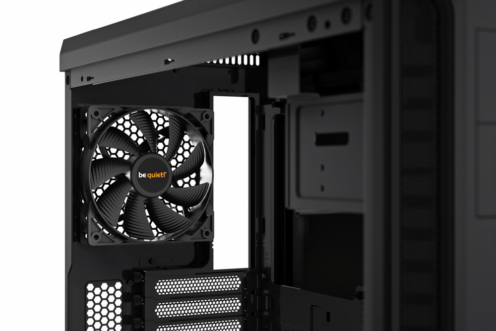Die Pure Base 600 ist mit schalldämpfenden Materialien an den Vorder-, Ober- und Seitenpaneelen ausgestattet, was für einen flüsterleisen Betrieb sorgt. Die mitgelieferten Pure Wings 2 Lüfter (1 x 120 mm vorne und 1 x 140 mm hinten) bieten eine effiziente und leise Kühlung. Zusätzlich bietet das Gehäuse Platz für zusätzliche Lüfter und unterstützt Wasserkühlung mit Radiatoren bis zu 360 mm.