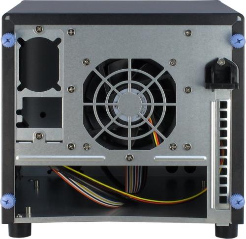 Es kann ein Flex-ATX-Netzteil oder 1HE Servernetzteil verbaut werden. Eine Slot Öffnung eignet sich für den Einbau einer kurzen flachen Grafikkarte. Intern kann noch eine 2,5" HDD oder SSD eingebaut werden.