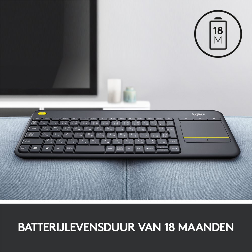 Dank der kompakten Größe der Logitech K400 Plus passt sie leicht auf deinen Schoß oder auf einen Tisch. Die Tastatur verfügt über ein QWERTY-Layout mit niederländischen Tasten, sodass du schnell und einfach tippen kannst. Das Touchpad bietet zudem spezielle Funktionen wie Scrollen und Zoomen, mit denen du effizient durch Seiten navigieren kannst.