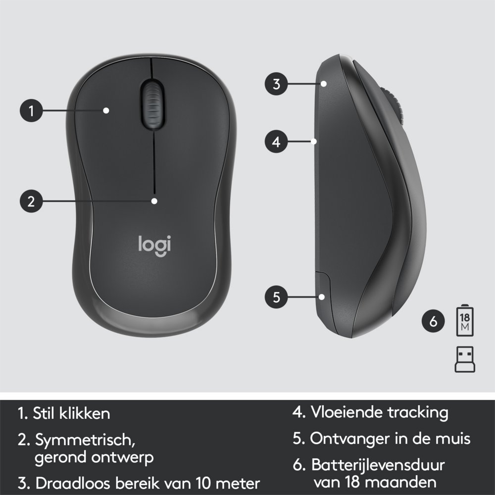 Stabile, zuverlässige und verzögerungsfreie drahtlose 2,4-GHz-Verbindung mit einer Reichweite von 10 m und einem kleinen USB-Empfänger für einen aufgeräumten Schreibtisch.