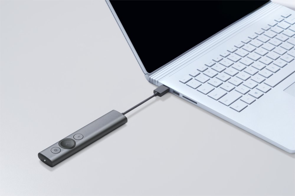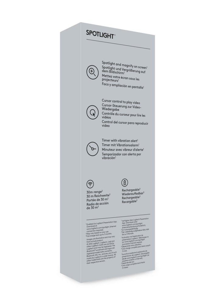 Spotlight lässt sich sofort über einen USB-Empfänger oder Bluetooth® Smart verbinden. Spotlight ist auf den meisten Plattformen Plug-and-Play-fähig und mit allen gängigen Präsentationsanwendungen kompatibel. Außerdem ist das Gerät vollständig wiederaufladbar und hat eine Reichweite von 30 Metern.