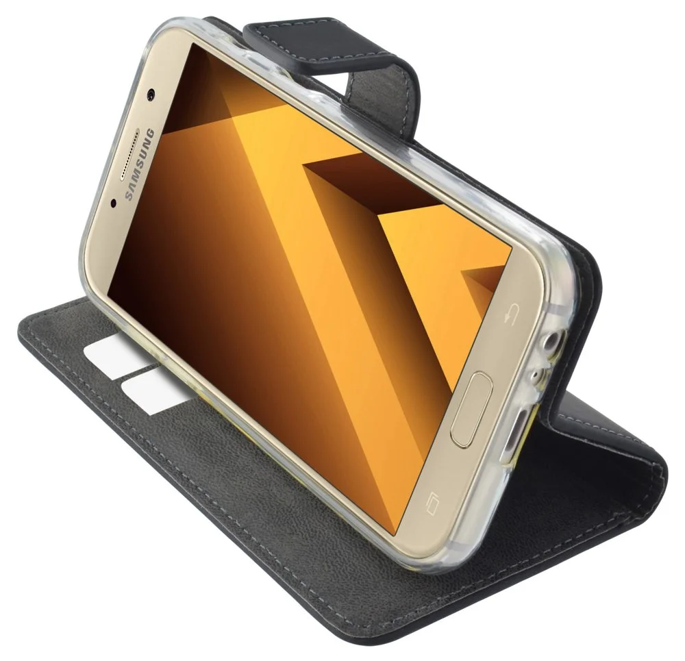Mobiparts 51296. Etui-Typ: Geldbörsenhülle, Markenkompatibilität: Samsung, Kompatibilität: Galaxy A3 (2017), Maximale Bildschirmgröße: 11,9 cm (4.7 Zoll), Oberflächenfärbung: Monochromatisch, Produktfarbe: Schwarz, Desktop-Ständer, Anzahl der Kartentaschen: 2