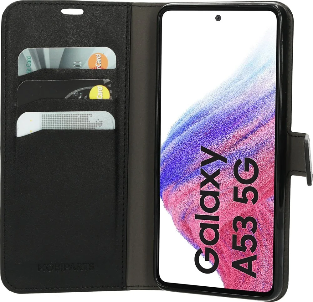 Mobiparts Classic Wallet. Etui-Typ: Geldbörsenhülle, Markenkompatibilität: Samsung, Kompatibilität: Galaxy A53 (2022) 5G, Maximale Bildschirmgröße: 16,5 cm (6.5 Zoll), Oberflächenfärbung: Monochromatisch, Produktfarbe: Schwarz, Anzahl der Kartentaschen: 4