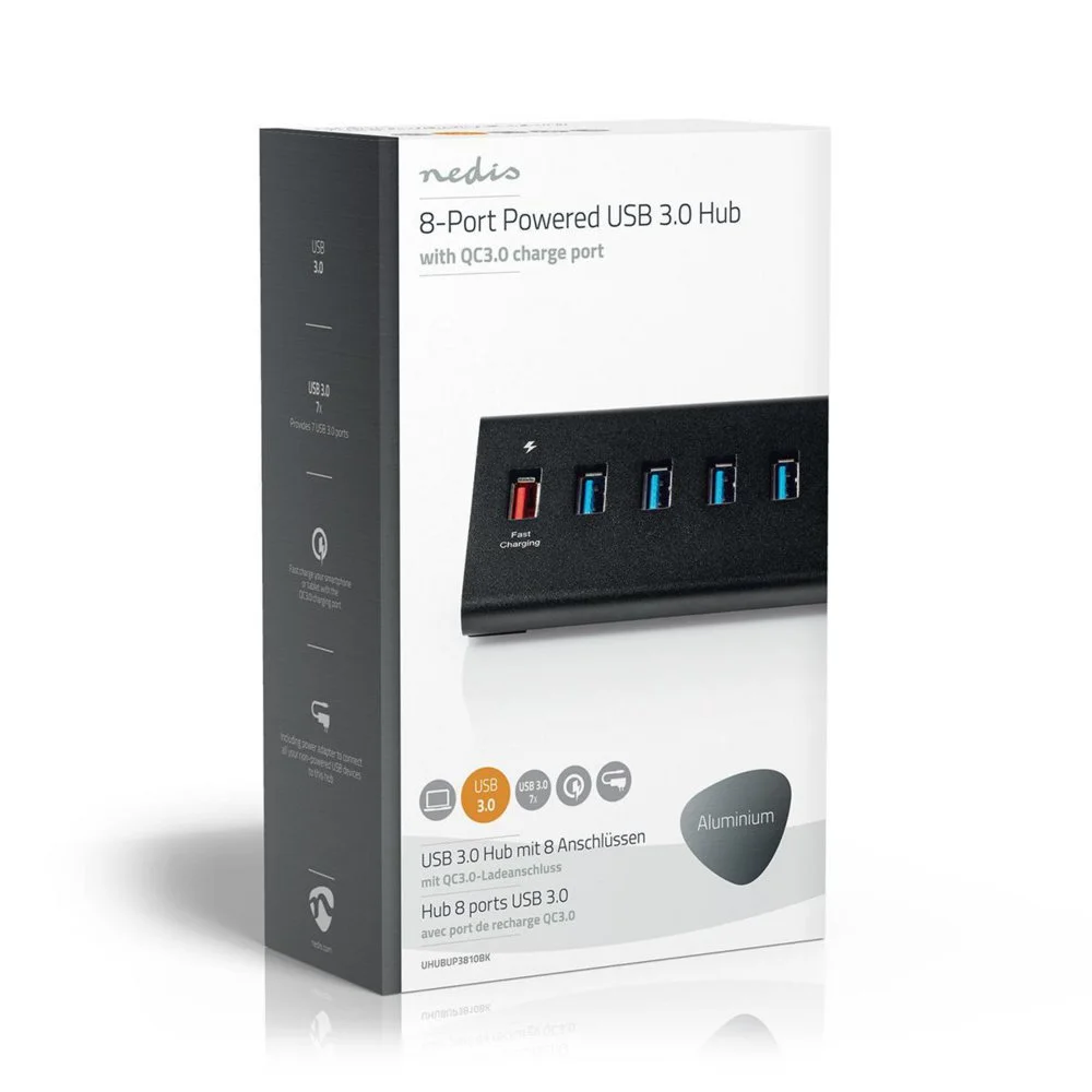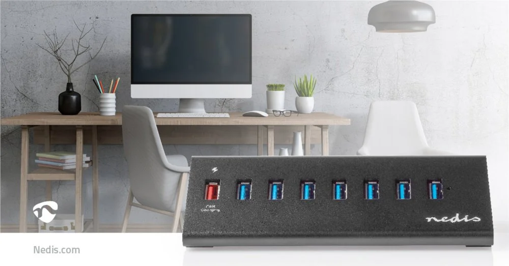 Nedis USB 3.0 Hub für PCs oder Notebooks zur Erweiterung der verfügbaren USB-Anschlüsse für USB-Festplatten, Mäuse, Drucker, Netzwerkadapter und andere Geräte. Er ist ausgestattet mit einem externen Netzteil zur Unterstützung der Stromversorgung leistungsstarker Zusatzgeräte wie 2,5-Zoll-Festplatten.
