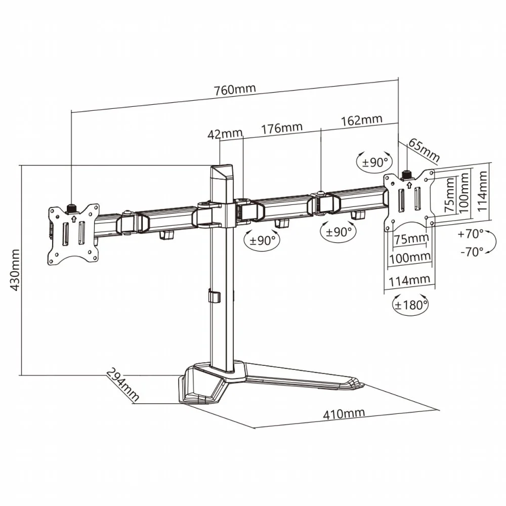 Der TUTANKHAMUN ist mit einer VESA-Montageplatte kompatibel mit VESA 75x75 mm und 100x100 mm ausgestattet, wodurch er für eine breite Palette von Monitoren geeignet ist. Die Arme sind vollständig verstellbar, mit einer Neigung von +90° bis -90°, einer Drehung von +180° bis -180° und einem Schwenkbereich von +90° bis -90°. Dadurch können Nutzer ihre Monitore in die gewünschte Position für optimalen Komfort und Produktivität bringen.