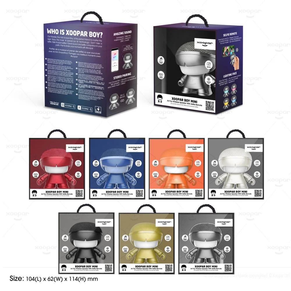 Xoopar Mini Xboy. Audio Kanäle: 1.0 Kanäle. RMS-Leistung: 3 W. Übertragungstechnik: Kabellos, Bluethooth-Reichweite: 10 m. Produkttyp: Tragbarer Stereo-Lautsprecher, Produktfarbe: Blau, Produktdesign: andere. Empfohlene Nutzung: Universal
